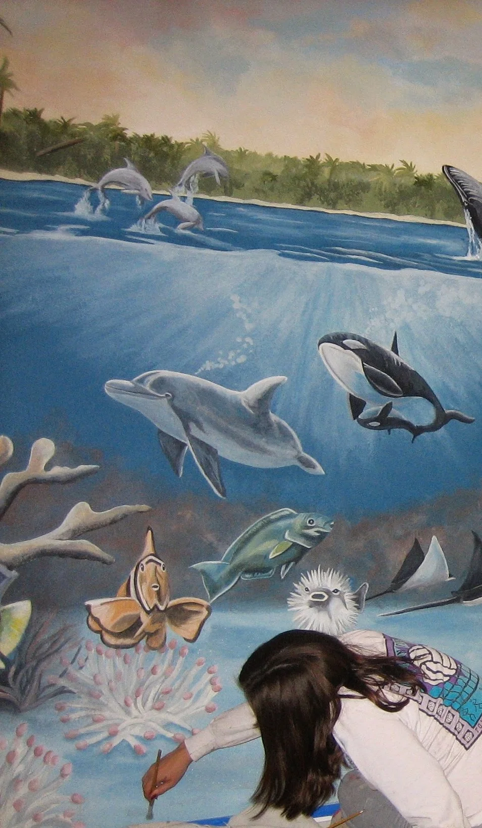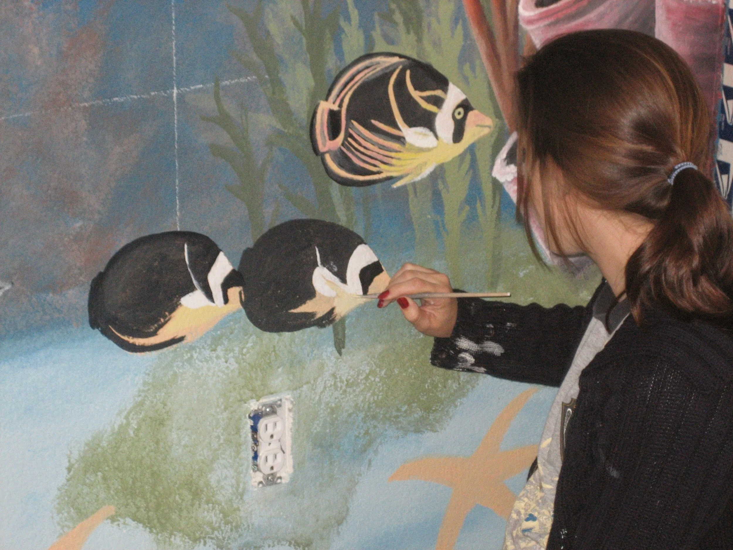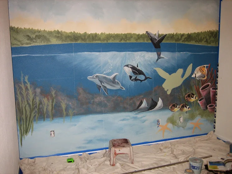 This painting was for a new baby's room. The gender was unkown so a neutral underwater and outerspace theme was chosen.