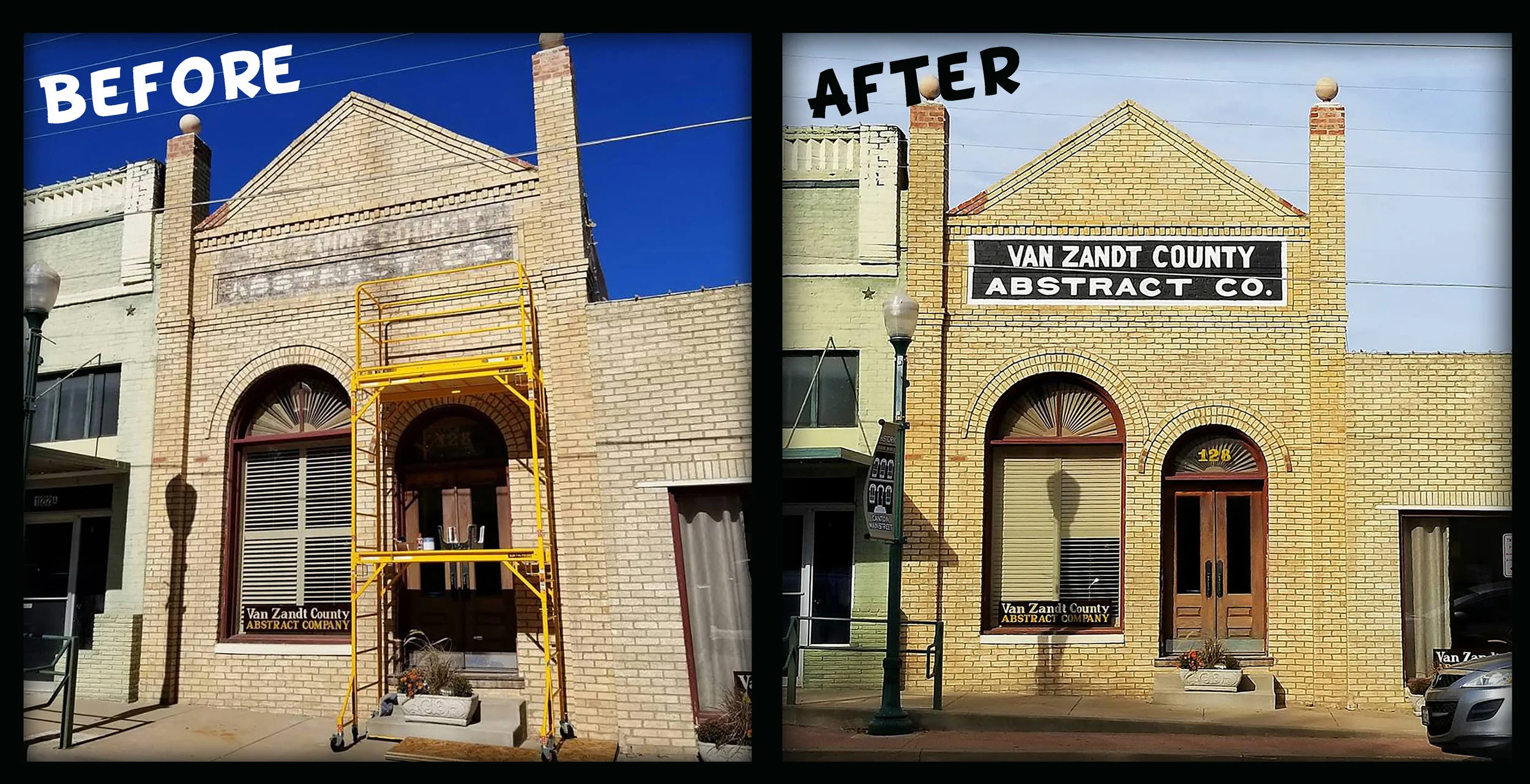 For over a century, Van Zandt County Abstract and Title Company has been instilling bedrock confidence in property owners, purchasers, and lenders in Van Zandt County. The company has been dedicated to taking care of their historic building in downtown Canton. In 2018, the brick was repointed and the windows were repaired. To top it off, the historic painted business sign was repainted. Below are the before and after pictures: